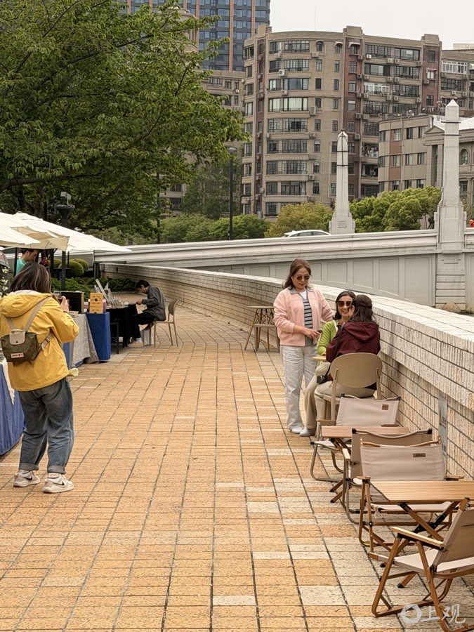 文创板块,以《良友》画报创刊100周年为引子,设计了“《良友》画报”“阅读上海”“光影成书”主题摊位,还有“‘书’妆时光·摩登上海”传统服饰、妆造体验。“聆听者”黑胶唱片盲盒,《良友》系列百年限定徽章、冰箱贴,非遗手工艺品,让人目不暇接。沿着河岸,摆开了几张露营椅,不论是买杯咖啡还是体验一口养生茶,都能坐下来歇歇脚。一系列“别光看,一起玩”沉浸式手作体验活动,如“旧书穿新衣”书衣手作、留声机木质音乐盒制作,缫丝织造、器物彩绘、漂漆技法等非遗体验也将陆续举办。